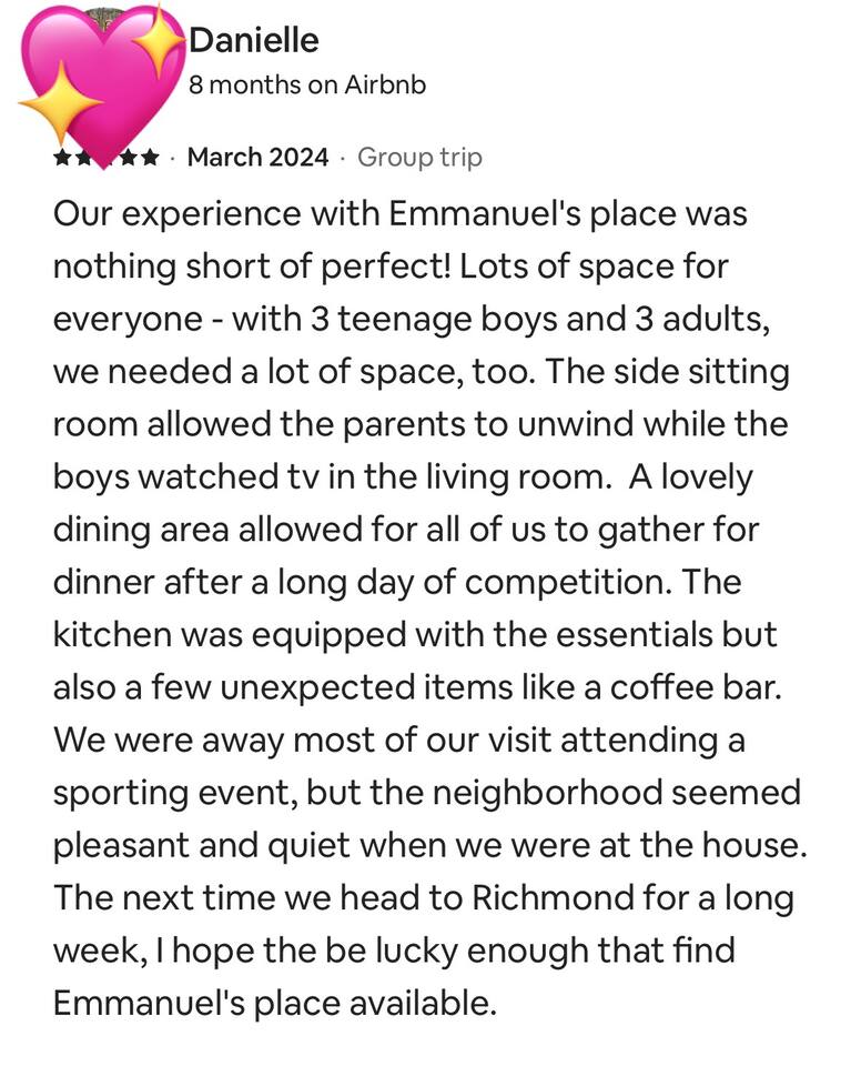 Welcome to your serene and spacious haven! This inviting home w/ a large deck is perfect for relaxing and unwinding, located just 16 minutes from the heart of downtown Richmond and 35 minutes from Kings Dominion. Whether you're traveling for business or leisure, you'll appreciate the comfort and convenience this home offers. Stream your favorite shows on free WI-FI across 4 Smart HDTVs, or find tranquility on the peaceful deck surrounded by towering trees. We look forward to hosting you!